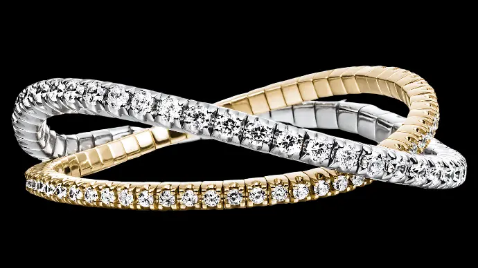 Diamanten die in een cirkel aan elkaar zijn geregen, schitteren in de nieuwe DAZZLING-DIAMONDS FLEX-collectie.